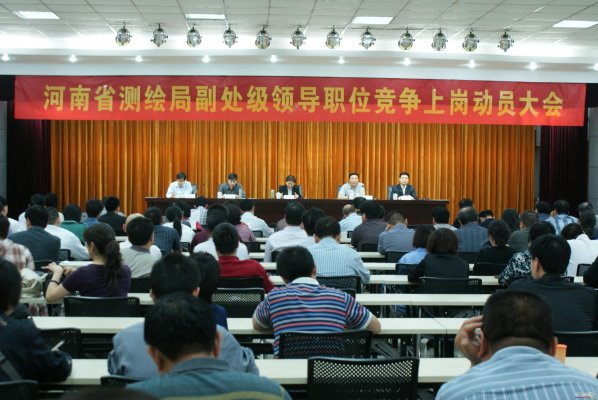 本网讯 记者王红闯报道 为了深化干部人事制度改革,拓宽选人用人渠道,加大选拔优秀年轻干部力度,着力高素质测绘队伍建设,5月4日,河南省测绘局召开副处级领导职位竞争上岗工作动员大会,河南省测绘局党委在全局范围内首次开展竞争性选拔局属单位及机关副处级干部工作,全局副科级以上干部100余人参加了动员会。