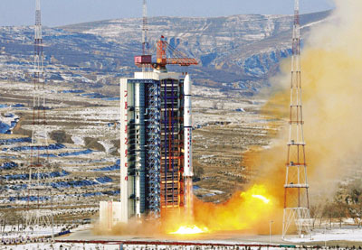 | 9日,中国首颗高精度民用立体测绘卫星“资源三号”,在太原卫星发射中心由“长征四号乙”运载火箭成功发射升空。中新社 |