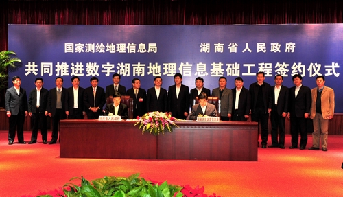 湖南省人民政府常务副省长于来山和国家测绘地理信息局党组成员、副局长李维森分别代表双方在协议书上签字。