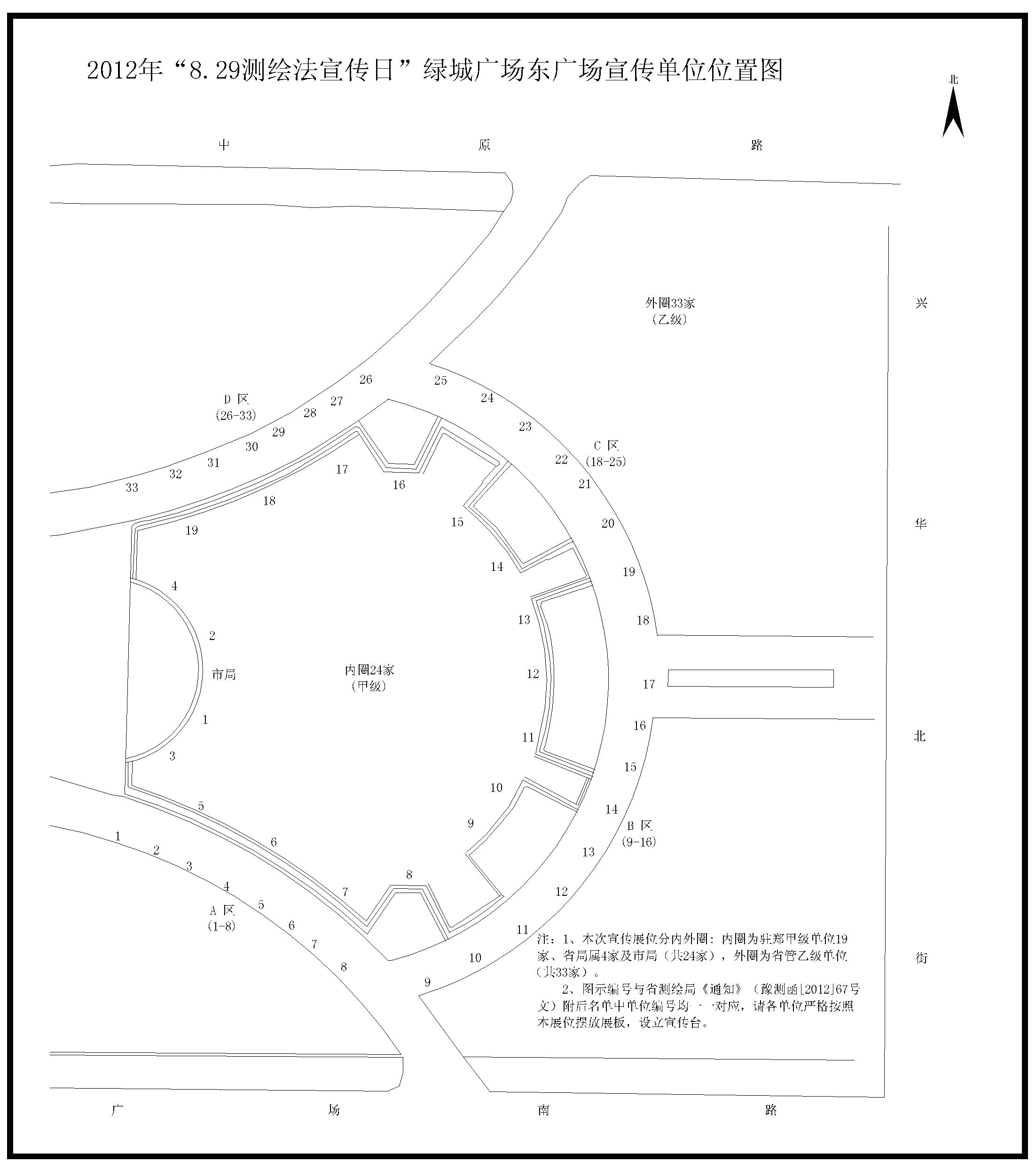 (二)郑州市局负责宣传展点的布置。“8·29”宣传日当天,在东广场中心位置搭建彩虹门、彩虹门悬挂“庆祝《中华人民共和国测绘法》修订颁布10周年”标语,同时两边飘放气柱和大型气球,发放法制宣传地图及宣传用品。