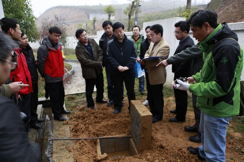 李维森首先来到湖南省怀化市,实地察看了新建国家水准点埋石情况,详细了解埋石建造规格、点之记准确性、标志委托保管等内容,听取了作业人员的现场介绍。他随后来到湖南邵阳市看望了正在那里进行野外水准观测的队员。李维森听取了工程项目部、重庆测绘院工作人员的现场工作汇报,了解了外业职工代表的作业感受和体会,并为外业职工发放了慰问品。