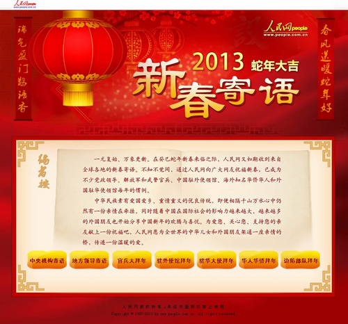 蛟龙奔腾辞旧岁,金蛇喜舞迎新春。值此新春佳节即将到来之际,我谨代表国家测绘地理信息局,通过人民网向各位网民,向长期以来始终关心、支持测绘地理信息事业的社会各界朋友,致以诚挚的谢意和新春的祝福!