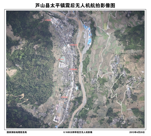 4月20日下午17时左右,国家测绘地理信息局紧急派往雅安市芦山县的无人机成功获取到芦山县核心灾区太平镇的首批高分辨率航空影像,技术人员在第一时间赶制出了第一张芦山县太平镇震后无人机航拍影像图,分辨率达到0.16米。芦山县太平镇震后航拍影像图将提供给国务院应急办、国家减灾委、国土资源部、中国地震局、四川省有关部门等,用于指挥决策和抢险救灾。