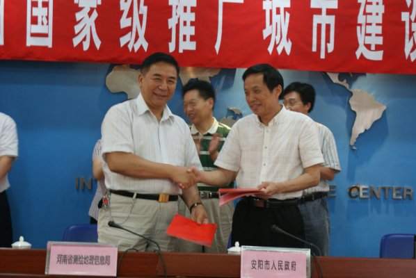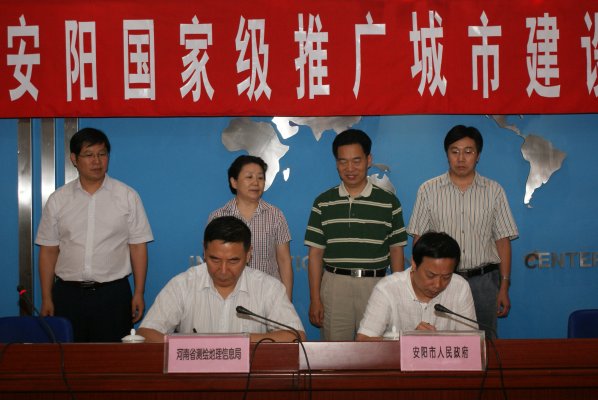 启动仪式上,河南省测绘地理信息局禄丰年和安阳市政府郭建华代表双方签订数字安阳地理空间框架建设项目合作协议书。