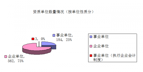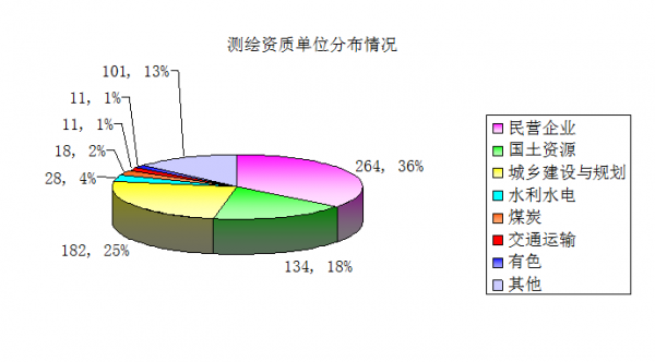 由上图可以看出,资质单位数在各系统分布不均衡。民营企业占测绘资质总数的36%,其次是隶属于城乡建设和规划、国土资源系统的测绘资质单位数分别为182家、134家,各占资质总数的25%和18%。