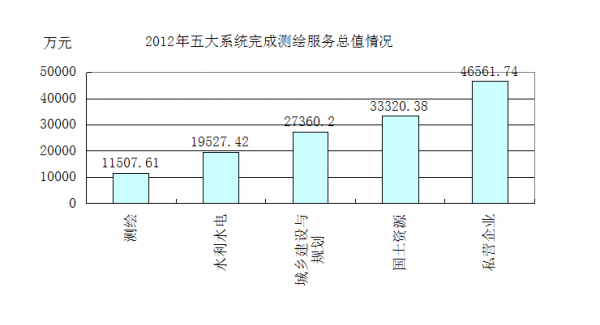 在2012年,测绘成果集中在交通、地矿、水利、电力等行业中。