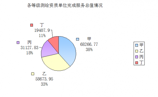 全省甲级资质单位共完成测绘服务总值为68266.77万元;全省乙级测绘资质单位共完成测绘服务总值为58673.95万元;全省丙级资质单位共完成测绘服务总值为31127.83万元;全省丁级资质单位共完成测绘服务总值为19407.9万元。