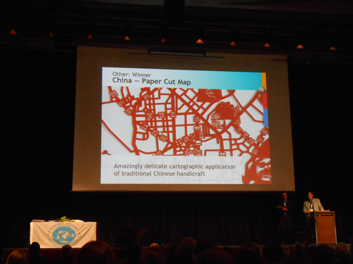 国际地图制图协会地图奖是国际地图制图界的最高荣誉。本届国际地图展览参展作品分为纸质地图、地图集、数字产品、教学地图产品和其他地图产品5大类。所有参展作品通过国际专家委员会评审和参会代表自愿投票进行评选,专家评审委员会从每类作品中评出3件获奖作品,参会代表投票选出1件大奖获奖作品。今年共有来自35个国家的529件作品参展。中国参展作品的征集、评审工作由中国测绘学会组织,从中国测绘学会2012年优秀地图作品裴秀奖中优中选优,遴选出12件作品参加国际地图展览评奖,最终获得4项大奖。(张世柏2013.9.16)