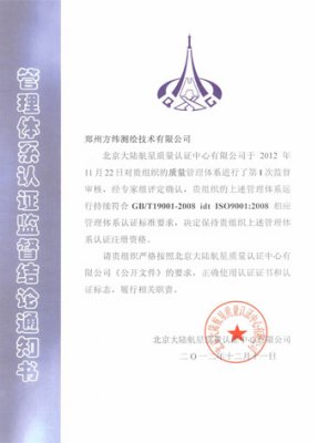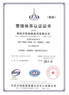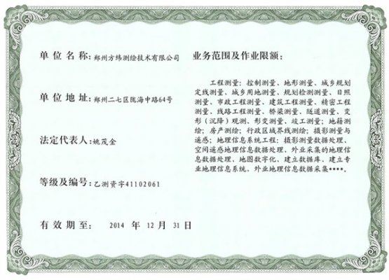 郑州方纬测绘技术有限公司成立于2007年4月28日,现注册资金210万元,乙级测绘资质,通过ISO9001质量管理认证体系,并列入河南省土地调查名录,办公场地284平方米,公司办公地址在郑州市陇海中路64号,公司下设外业测量生产部、内业数据部、航空摄影测量部、技术质量部、办公室、市场部六个部门,并且制定严格的生产、质量、技术、保密、安全等系列管理章程制度。