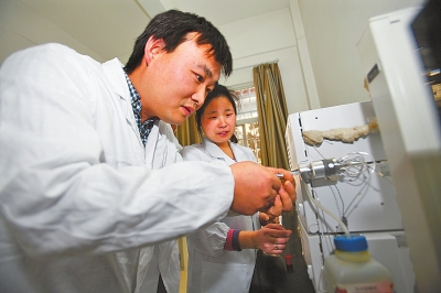 “从家到公司,骑摩托车不到10分钟路程,每天早晨7点40分从家里出门,不耽误8点钟到厂里上班。周日休息,还可以帮父母种种地。”刘延茂说。去年8月,他与女友璩泰晓喜结连理,小璩也在集聚区内的一家企业上班。小两口家庭事业双丰收。说起这些,刘延茂不由得笑逐颜开。图为刘延茂正在公司实验室工作。(摄于12月5日)(记者 史长来 摄)
