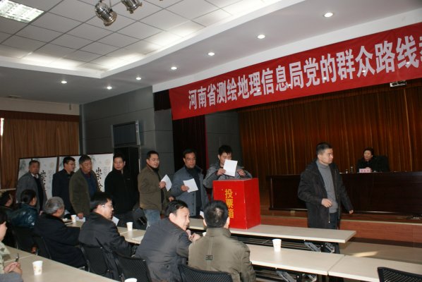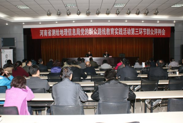 2013年最后一天,12月31日,在第一批党的群众路线教育活动收尾即将结束之际,河南省测绘地理信息局召开了“整改落实、建章立制”第三环节群众评判会。会议由河南省测绘地理信息局局长、局活动领导小组组长贾志伟同志主持并进行情况通报,省国土资源厅督导组组长、副厅长文茂林同志出席会议并作重要讲话。局机关部分党员干部、局属单位负责人、群众监督员和部分省辖市测绘地理信息行政主管部门负责人代表、测绘管理科(局)长代表、甲乙级测绘资质单位代表共70人参加了评判会。
