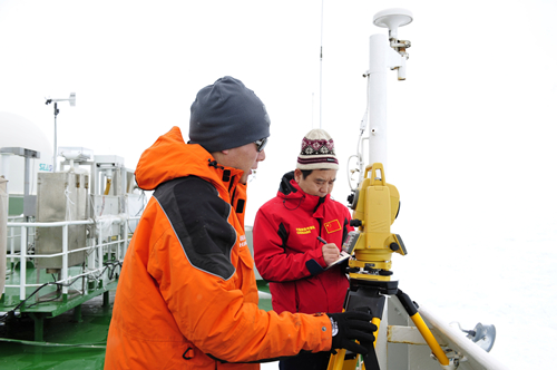 “雪龙”号被困冰区后,韩惠军和颜小平决定利用测绘手段为“雪龙”号脱困做些工作。他们在船的顶层甲板架设全站仪,每隔2小时观测一次船周边的冰山,通过积累观测数据,计算得出冰山的移动速率和轨迹,及时将数据提供给科考队,为“雪龙”号破冰突围提供帮助。