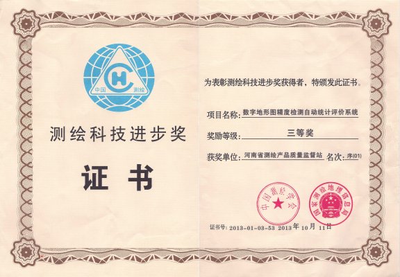 由河南省测绘产品质量监督站自主研发的《数字地形图精度检测自动统计评价系统》被河南省测绘科学技术进步评审委员会评为“2012年度河南省测绘科技进步壹等奖”,同时,荣获“2013年度国家测绘地理信息局测绘科技进步三等奖”。