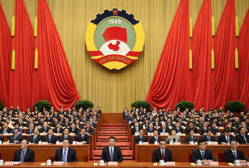 3月3日,中国人民政治协商会议第十二届全国委员会第二次会议在北京人民大会堂开幕。这是习近平、李克强、张德江、刘云山、王岐山、张高丽在主席台就座。新华社记者兰红光摄