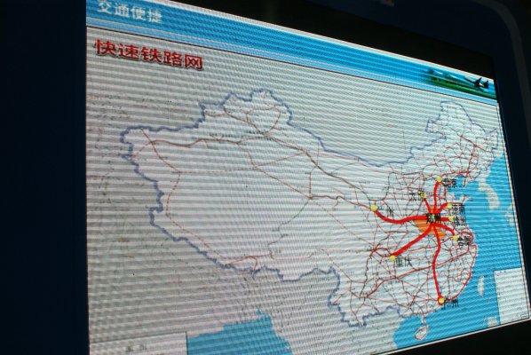 在全省十八省辖市和省十个直管县的展厅进口处,大屏幕电子屏,用地图滚动播放着交通便捷的河南,航空:郑州机场货运航线网络发展发展示意图等,民航交通圈图还标注着各类数字信息,民航1小时交通圈半径为700公里,覆盖地区人口约4.5亿人,GDP约15万亿元,民航2小时交通圈半径为1400公里,覆盖地区人口约12亿人,GDP约43万亿元;铁路:郑欧国际铁路集装箱货运班列运行路线示意图、快速铁路网图等。公路:国家高速公路网图、国家普通公路网、两纵两横高速路网等,高速公路也像民航一样标注有高速公路1小时交通圈和2小时交通圈覆盖的城市、人口和GDP值。参观的客商和领导不是驻足观看,赞叹不已,通过地图更进一步直观了解了投资河南交通的便利,增加了投资河南、落户河南的信心。