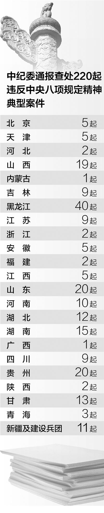 14日上午,中央纪委监察部网站通报了各级纪检监察机关从4月8日至11日查处的220件违反中央八项规定精神典型案件。盘点被通报的220起案件可以发现,公车私用、公款旅游、大办宴席、违规发放财物等情况仍较为突出。