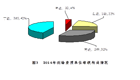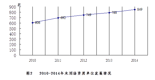 2014年对788家测绘资质单位进行了复审换证工作。截止2014年末,河南省拥有测绘资质单位共有849家,比2013年测绘资质单位增长7.74%。其中新批测绘资质单位66家,乙级升甲级6家。见(图2)。