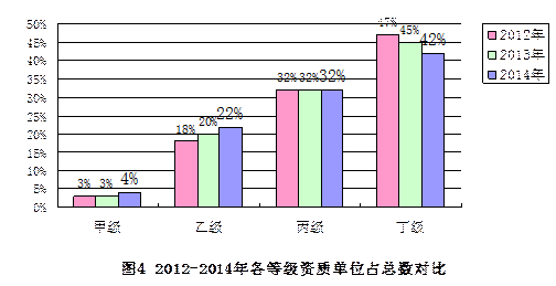 2014年末,全省测绘资质单位849家中甲级32家,比2013年增长23.08%,乙级183家,丙级269家,丁级365家,比2013年测绘各等级单位数占总数的比例有所变化(见图3)。由于资质单位自身规模在不断扩大,测绘资质队伍等级构成逐年优化提高,所以甲、乙级占总资质单位数比例逐年提高,丙级与去年持平,丁级所占比例却逐年减少。(见图4)