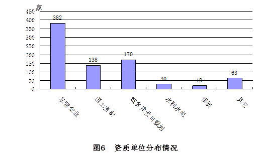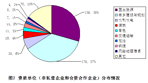 资质单位分布在各系统,私营企业占资质单位总数的45%,集中在工程测量专业方面;而非私营企业和合资合作企业集中隶属于城乡建设和规划、国土资源系统的测绘资质单位数分别为169家、138家,各占测绘单位总数的20%和16%。见(图6)和(图7)。