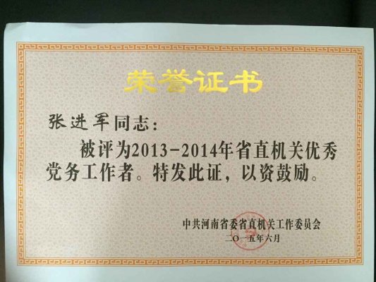 河南省基础地理信息中心党委副书记张进军同志荣获省直优秀党务工作者称号。