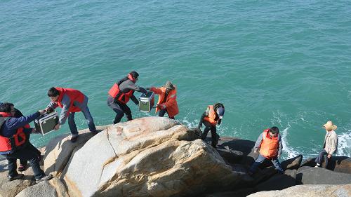 测绘队员在广东阳江市帆仔岛搬运重力测量设备(2010年12月28日摄)。新华社发