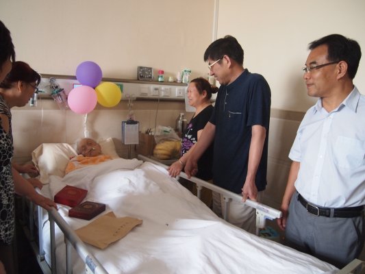 随后,王进福一行又来到省郑大二附院,为住在那里的乔翠英同志送上纪念章、慰问金和慰问品。今年93岁高龄的乔老虽然卧病不起,但是见到局领导非常高兴,临别前还依依不舍地伸出瘦弱的手紧紧握住同志们的手。王进福充满敬意地对老人说,我们现在能过上安定幸福的生活,离不开老红军、老同志们的流血牺牲和英勇战斗,我们要向先辈先进看齐学习,进一步继承和弘扬伟大的抗战精神,把党的优良传统代代相传,为河南测绘地理信息事业的发展做出更大贡献。
