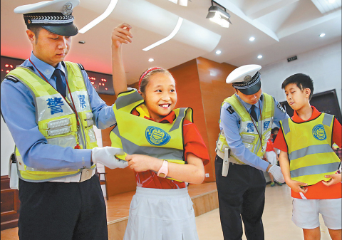 月27日,郑州市交巡警支队九大队免费向金水区纬三路小学的同学们发放2000件反光背心作为儿童节礼物,并给他们上交通安全课。(记者 王铮 摄)
