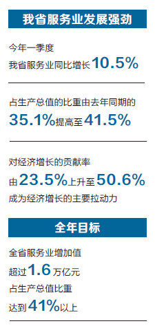 今年一季度,我省服务业同比增长10.5%,占生产总值的比重由去年同期的35.1%提高至41.5%,对经济增长的贡献率更是由23.5%上升至50.6%,成为经济增长的主要拉动力。