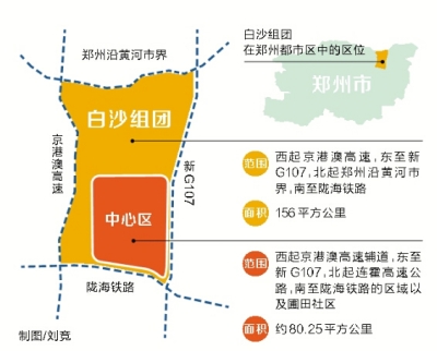 郑州往东,开封向西,白沙组团可谓郑汴融城的大手笔。从郑州市规划局提供的资料看,白沙组团规划范围西起京港澳高速,东至新G107,北起郑州沿黄河市界,南至陇海铁路,总面积约156平方公里。组团中心区范围包括西起京港澳高速辅道,东至新G107,北起连霍高速公路,南至陇海铁路的区域以及圃田社区,面积约80.25平方公里。