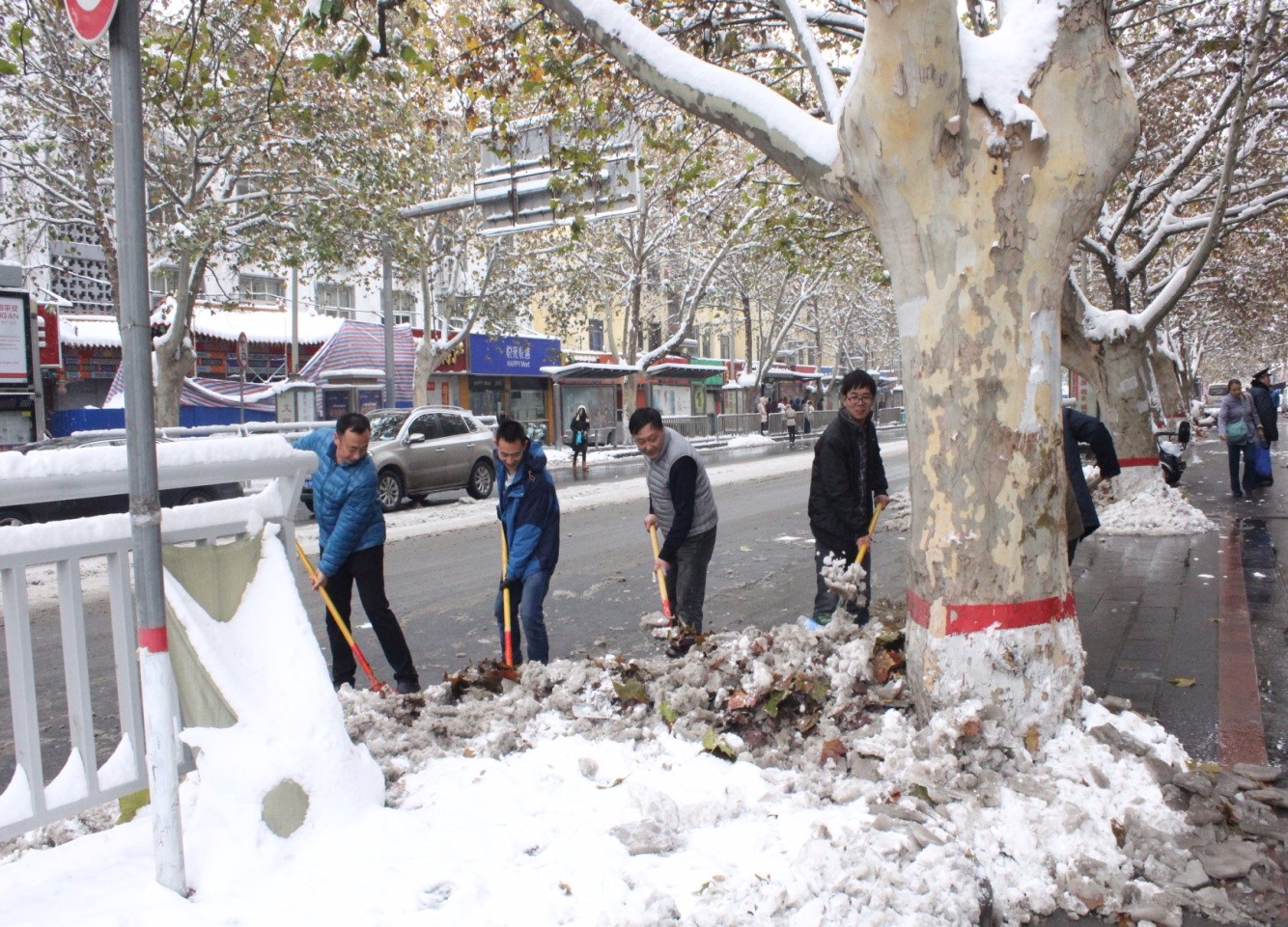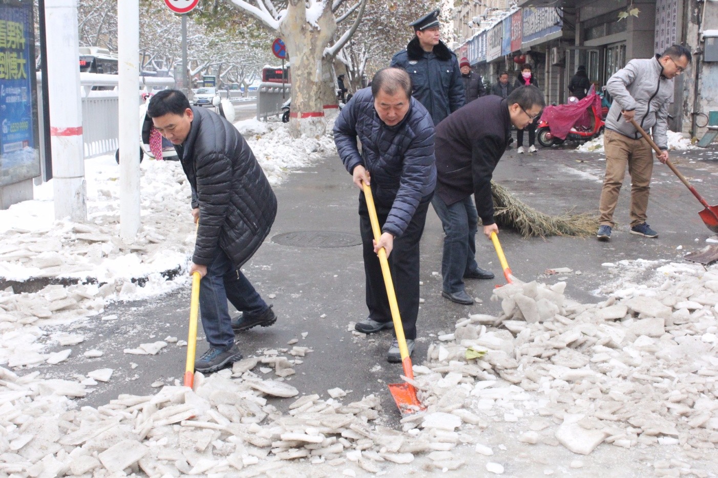 23日一早,河南省测绘工程院、省遥感测绘院、省基础地理信息中心和局后勤服务中心等单位的志愿者积极参与铲雪活动。志愿者手持铁锨、扫帚清理单位门口、街道口的积雪和冰霜;天气寒冷,手冻得冰凉,但大家干的热火朝天,头顶热气腾腾。面对地滑和坚冰,大家相互配合,使出全力,你敲我铲他扫,将人行道上周围的冰块和残雪清理干净。