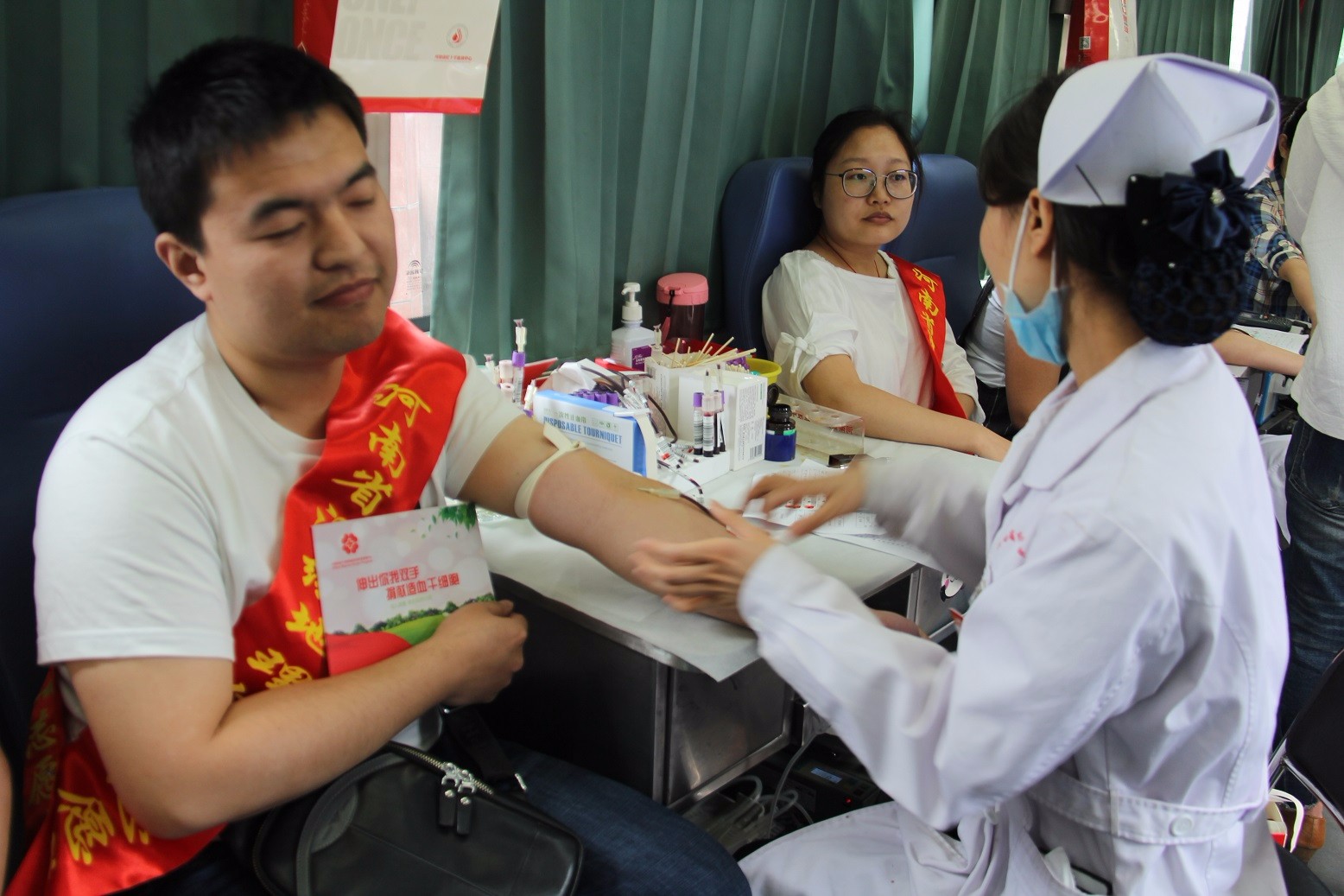 中心职工在医务人员的引导下,按序进行登记、填表、量血压、测血型等,顺利通过之后,有序地跨上献血车,挽起衣袖捐献出自己的一份热血。中心共3人参加此次活动,其中既有首次献血的年轻人,也有多次的献血志愿者——薛阳——自2009年开始每年献血两次,他说,无偿献血不仅是一种助人为乐的美德,更是应尽的责任和义务,它是一种爱心的体现,表示会将无偿献血继续下去,关爱他人,回馈社会。另两名中心职工还加入了造血干细胞志愿者的行列。