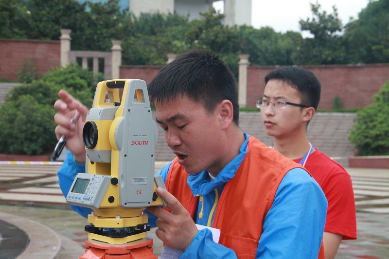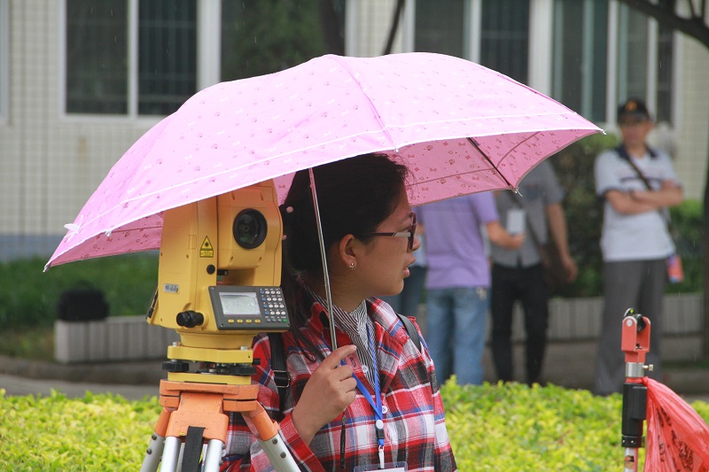 竞赛期间,尽管下降小雨,工程测量参赛选手仍然精神饱满、全力以赴投入比赛。有的再三仔细核对输入的已知点坐标,确保准确无误;有的手握棱镜杆,飞一般地奔跑在赛场,争夺宝贵时间;有的站在仪器旁,聚精会神,边测量边呼喊;有的服务人员,为选手喂水解渴;裁判员们也随着选手穿梭在竞赛赛场。地图制图赛场上,鼠标的敲击声紧张而活泼,每一位选手都紧盯着屏幕,认真仔细地绘制各种地物、地貌符号,期待取得好成绩。