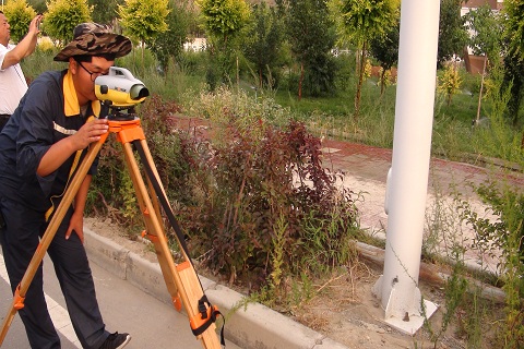 在这里的测区一线,我跟随有三名党员组成的测量小组实地进行采访,他们都是来自信阳北京华星公司的员工,都是主动报名,经过单位挑选参加这次任务的。今年32岁的张大千,来这里12天了,参加工作已经九个年头,当问起这次任务有什么感受时,他一边用GPS测点,一边很腼腆地说:“我有一个女儿,今天刚好4岁4个月,我来新疆家里很支持,我也很想来参加这次任务,因为在祖国的边陲进行作业,虽然很苦,但感觉很有意义!”陈俊观测,马强跑棱镜,两个人配合得很默契,28岁的陈俊参加工作四年,驻马店人,他全神贯注地观测着全站仪,俨然一个边陲看守边境线的哨兵,工作已经八年的马强,今年31岁,孩子才刚两岁,这次援疆也是他自告奋勇,他在戈壁滩30米左右竖立一下棱镜测高程,在工业园区的房角、电线杆、电缆桩等地物附近不停地放棱镜测点,不停地奔跑着!这组党员先锋岗三名队员的身影成为戈壁滩上一道亮丽的风景线。