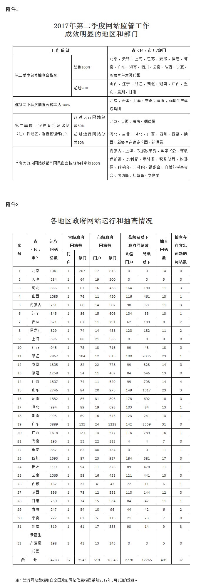 附件:1.2017年第二季度网站监管工作成效明显的地区和部门