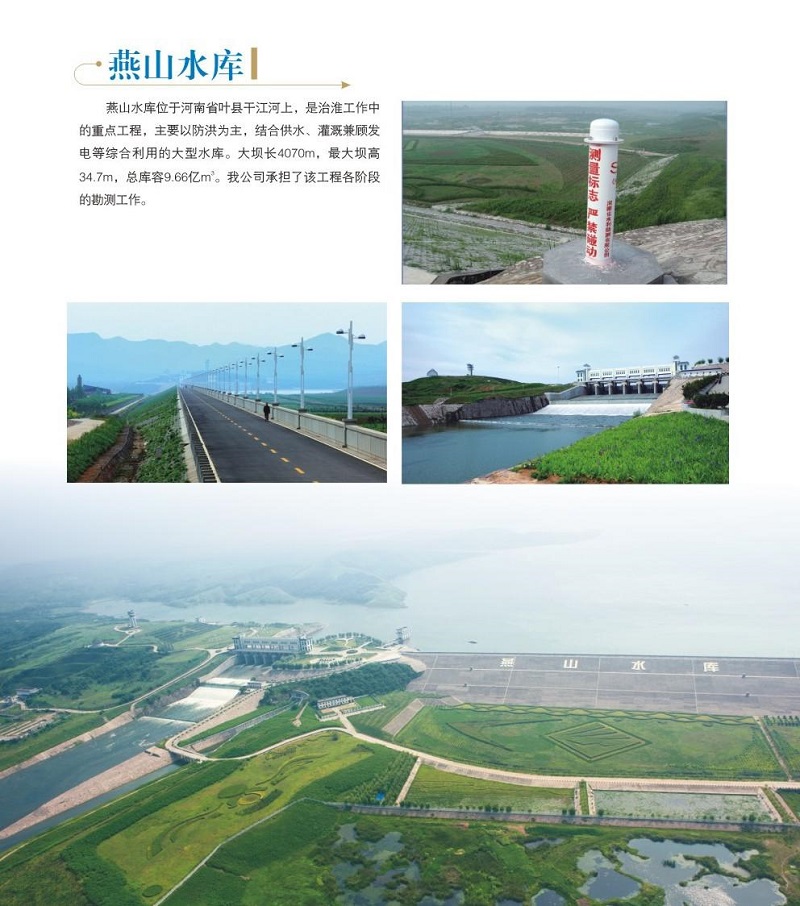 公司曾先后完成了南湾、陆浑、宿鸭湖、白龟山、盘石头、燕山等30余座大、中型水库和南湾、三义寨、赵口等10余处大型灌渠的测量工作;跨省区承担了新疆桑株水库、克孜尔水库、和丰加音塔拉水库以及山东省胜利油田孤北、纯化水库,广东天堂山水库、内蒙古河套灌区等水利水电工程的测量工作。