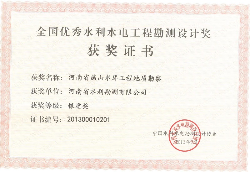 公司先后获省、部级以上优秀工程奖60余项,其中国家银质奖1项,铜质奖1项、大禹奖1项,科技进步奖5项; “断面之星-2003软件”获河南省科技进步奖,30余项国家发明、实用新型专利和软件著作权。先后获得“全国工程勘察先进单位”、“全国工程勘察设计行业诚信单位”、“河南省五一劳动奖状”、“南水北调先进单位”、“抗震救灾援建先进奖”等数十项荣誉称号。
